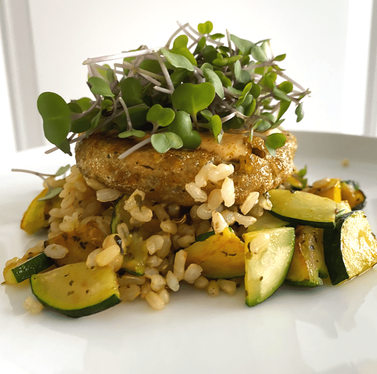 - To plate: Add 1/2 c or so of rice and veggie mixture to the plate, top with jackfruit cake. Add a dollop of curry sauce mixture onto jackfruit cake and top with microgreens.