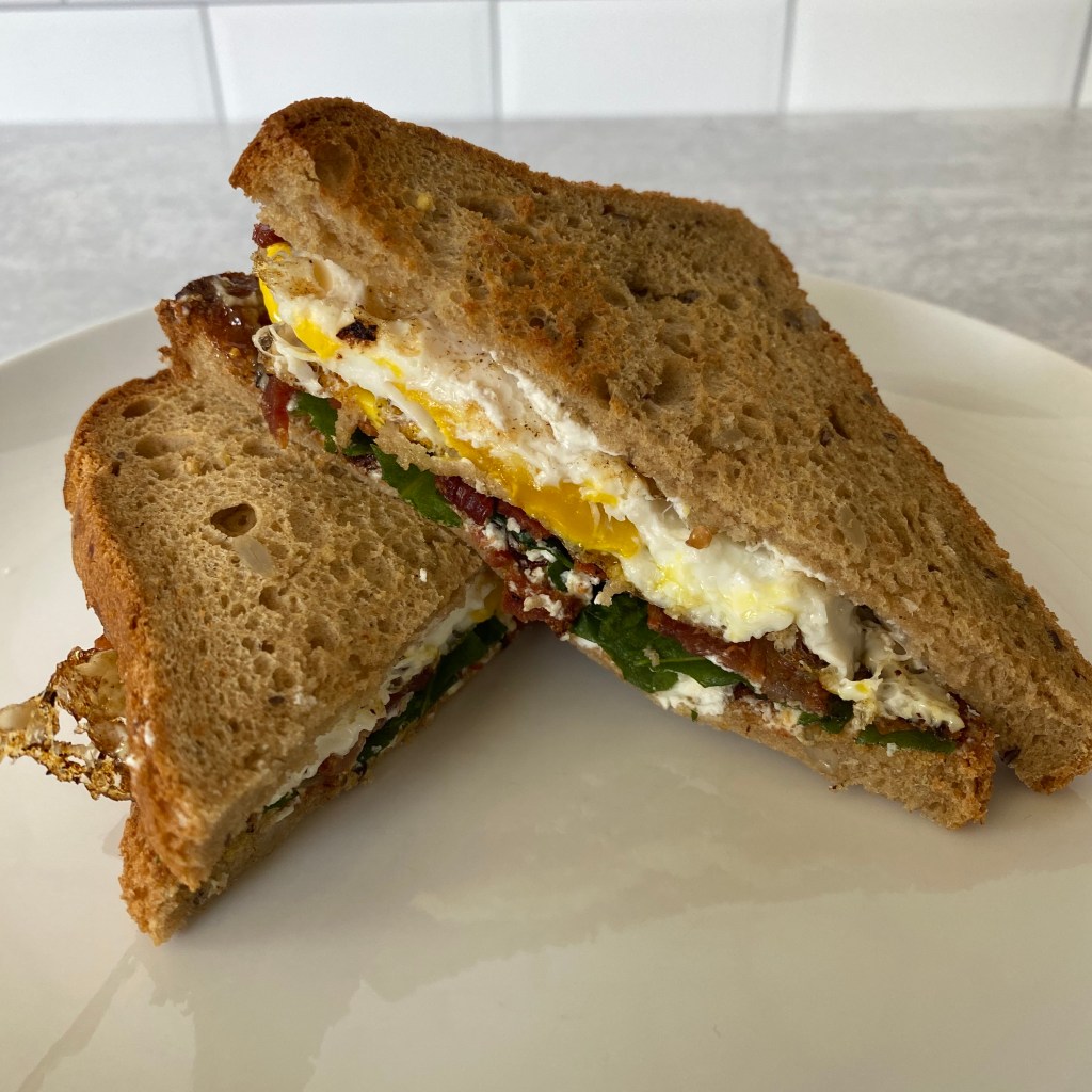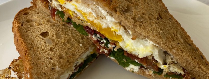 - Assemble your sandwich by spreading goat cheese on one piece of toast and fig preserves on the second. (If you’re omitting the bacon, sprinkle the fig preserves side with a little finishing salt.) Then layer the bacon, egg, shallot, and arugula to your desired ratios. Top with your second piece of toast and enjoy!