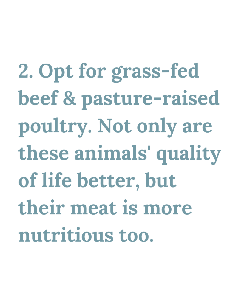 2. Compared to their conventional counterparts, grass-fed beef is higher in vitamins A, B, E, and other antioxidants. If grass-fed beef or pasture-raised poultry isn’t available at your grocery store, the next best thing is USDA Certified Organic. These animals aren’t exposed to antibiotics, growth hormones, or pesticides in their food supply at the same rate as conventional meat. As for conventional meat, we can cover animal cruelty and farmed meat practices another time. 😉